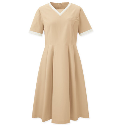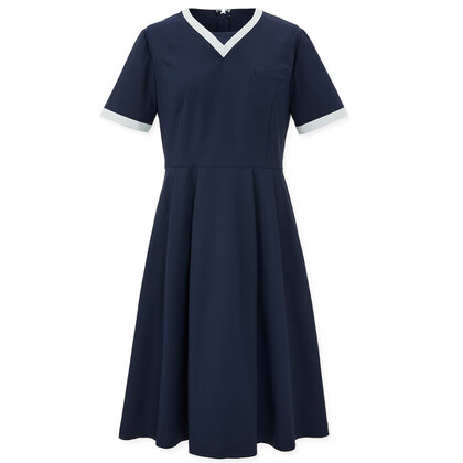 上質感のある素材に優雅なフレアーシルエット。Vネックと袖口のアクセントカラーが清楚な印象のワンピースです。体のラインを拾わない動きやすくいデザインも特徴。左胸スマホ対応ポケット、両腰にすっきりとしたスリットポケット付き。織物素材の《コンフォートストレッチツイル》は、特殊な加工技術により、ニットの様な高いストレッチ性を実現。優れたバックストレッチ性に加え、軽量感をプラスした柔らかい風合いが特長です。