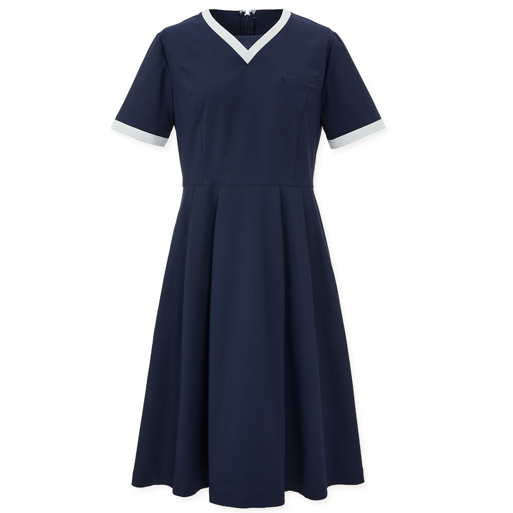 綺麗でもくどくない機能的な印象のワンピース。光沢のあるサテンのアクセントがお洒落です。前ファスナー、両腰ポケット(内ポケット付き)、両脇ポケット、右腰ループ、後ろ裾ボックスプリーツ仕様。織物素材の《ストレッチセンサー》は、防透性の高いストレッチ性能、軽量で疲れにくく、また特殊な断面繊維で吸汗速乾性にも優れた快適素材。工業洗濯対応・SEK(赤)・透け防止・吸汗・制電・ストレッチ素材。