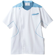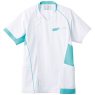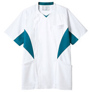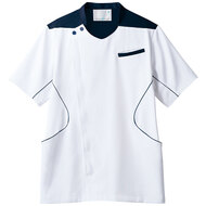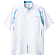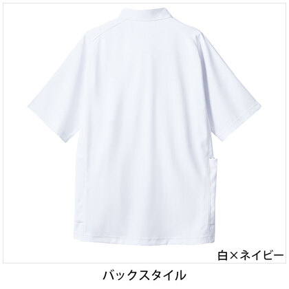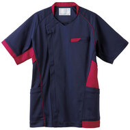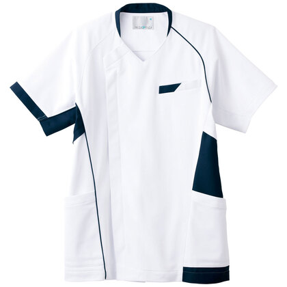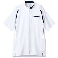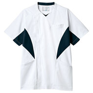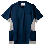 配色アクセントの視覚効果ですっきりシャープに見せる、メンズスクラブジャケット。左胸ポケット、両腰ポケット(内ポケット付き)、右脇ループ、サイドベンツ仕様。ニット素材の《NHP》ハイパーストレッチトリコットは、特殊技術により従来品の約3倍のストレッチ性、吸汗速乾性、制電性の上質素材。滑らかな肌ざわりと軽い着心地も特徴です。工業洗濯対応・SEK(赤)・吸汗速乾・制電・ストレッチ・防汚加工付