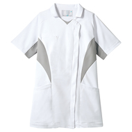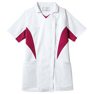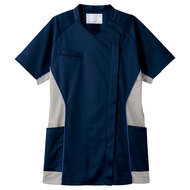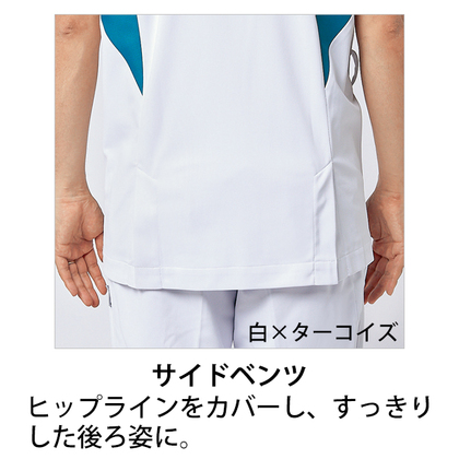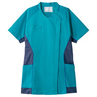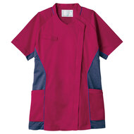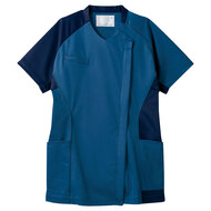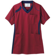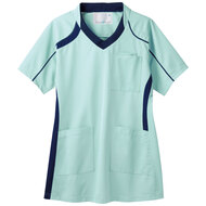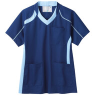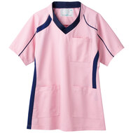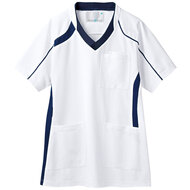 サイドの配色に汗シミの目立たない機能性素材「デュアルファイン」を採用したレディススクラブです。右胸ポケット、両腰ポケット、右脇ループ付き。本体のニット素材の《NHP》ハイパーストレッチトリコットは、特殊技術により従来品の約3倍のストレッチ性、吸汗速乾性、制電性の上質素材。滑らかな肌ざわりと軽い着心地も特徴です。工業洗濯対応・SEK(赤)・吸汗速乾・制電・ストレッチ・防汚加工付き。