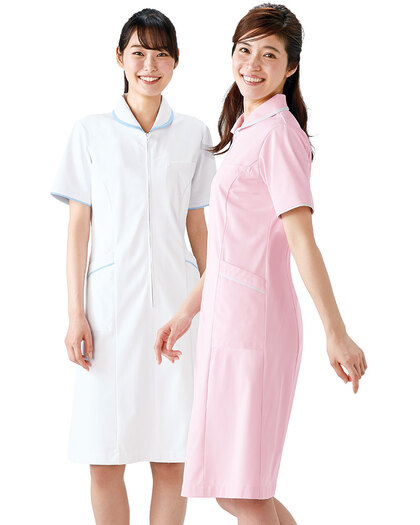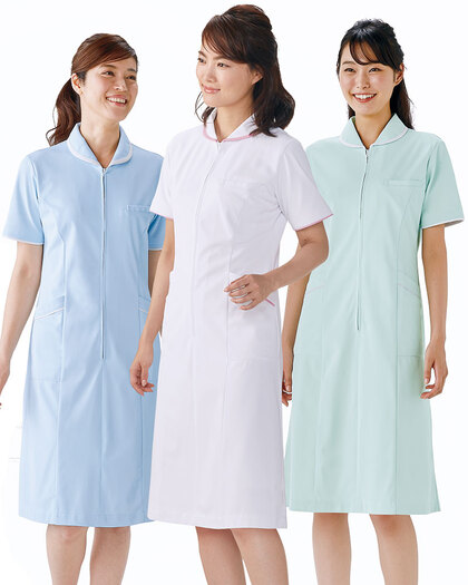 時代に合わせ現場の声で進化した、美しく快適なワンピースです。識別が簡単なカラー展開、窮屈感のない衿もと、年齢に応じた体形に左右されないシルエット、腕の可動域、ポケット収納力を大きく改善しています。左胸ポケット、右脇スマホポケット、両腰ポケット(内ポケット付き)、両脇ループ付き。白色にはニット素材の《NHC》ソフトトリコット、色物にはニット素材の《NHT》カラートリコットを使用しています。