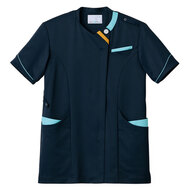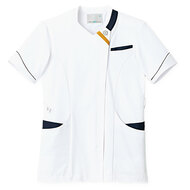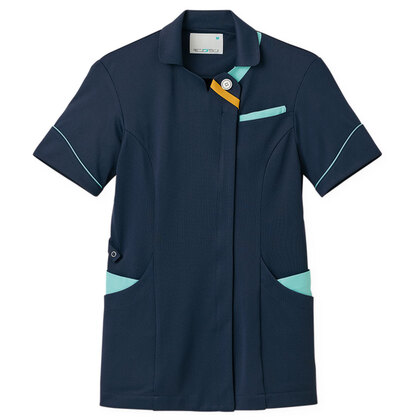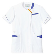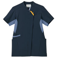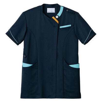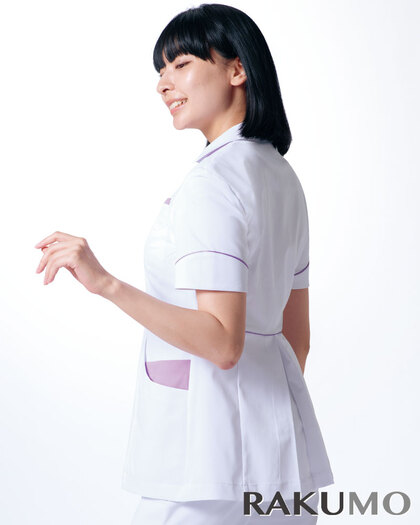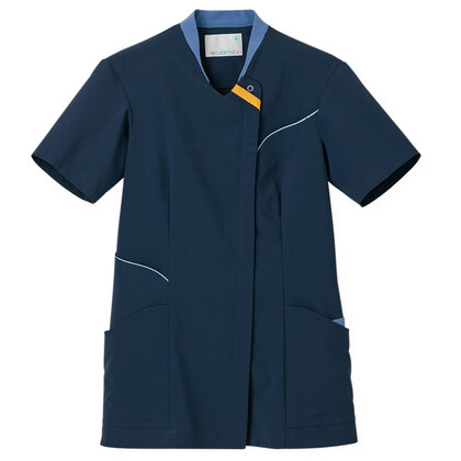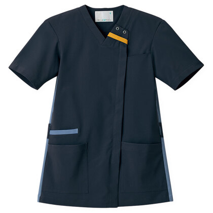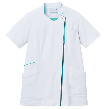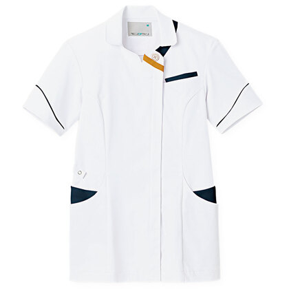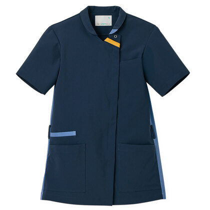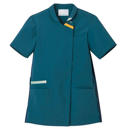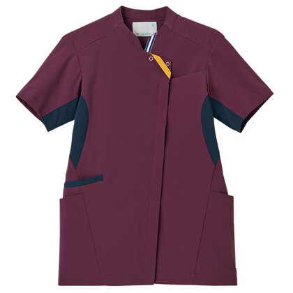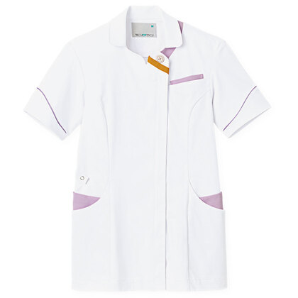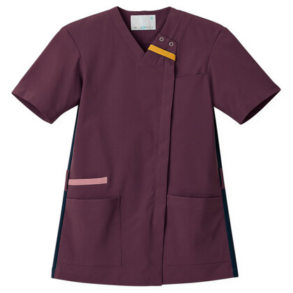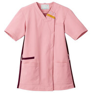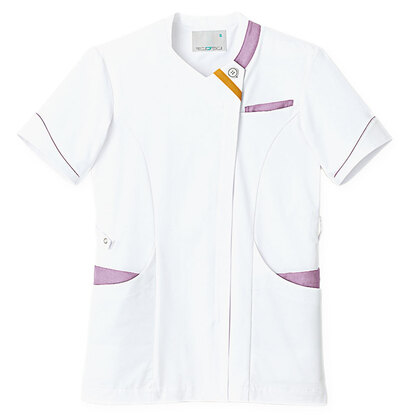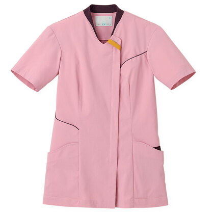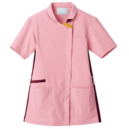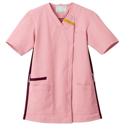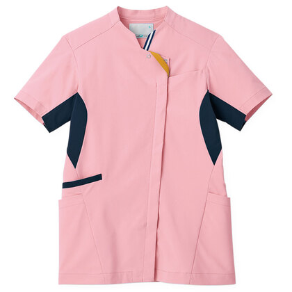 バネのようなストレッチが自慢の女性用衿付きSCRUBです。パステルカラーのアクセントに、曲線を多用した親しみやすさを感じるデザイン、衿もと識別テープ、左胸/両腰ポケット、左肩/両脇ループ、バックプリーツ仕様。織物素材の《WJK》ライトフィックスツイルは、滑らかな肌触りと強力なストレッチ性、上品な光沢感がある素材。ポリエステル100%。工業洗濯対応・SEK(赤)・透け防止・制電・ストレッチ素材。