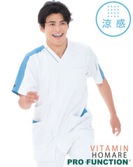 VネックとフロントZIPが軽快な印象の男女兼用スクラブです。左胸ポケット(PHS対応)、右腰ポケット(内ポケット付き)、左腰ポケット(ペンポケット付き)、右脇ループ、両脇スリット、袖後ろラグランスリーブ仕様。ニット素材の《RF》ワープニットは、生地に触れるとひんやりする接触冷感と高い通気性、優れた伸縮性が特徴。工業洗濯対応・SEK(赤)・制電、特種加工により吸汗、防汚性能が付加されています。