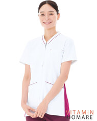 衿元の繊細なパイピングがお洒落な、接触冷感素材のレディススクラブです。左胸ポケット(PHSポケット付き)、両腰Wポケット、右腰キーループ付き。ニット素材の《RF》ワープニットは、生地に触れるとひんやりする接触冷感と高い通気性、優れた伸縮性が特徴。工業洗濯対応・SEK(赤)・制電、特種加工により吸汗、防汚性能が付加されています。