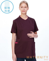 冷感素材、フロントファスナーで快適な妊婦さんのスクラブです。左胸ポケット(内側PHSポケット付)、両腰ダブルポケット、右脇ループ付き。ニット素材の《RF》ワープニットは、生地に触れるとひんやりする接触冷感と高い通気性、優れた伸縮性が特徴。工業洗濯対応・SEK(赤)・制電、特種加工により吸汗、防汚性能が付加されています。