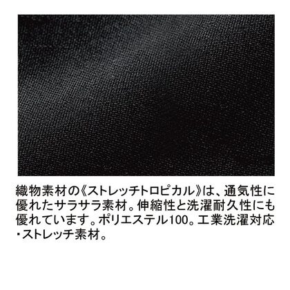 薄地で風通しが良く伸縮性のある平織素材を使用した、男女兼用ストレートパンツです。飲食関係のユニフォームとしても使用される万能パンツです。脇ゴム、ノータック、前ファスナー、後ろダーツ、両脇/両後ろポケット、ベルトループ付き。織物素材の《ストレッチトロピカル》は、通気性に優れたサラサラ素材。伸縮性と洗濯耐久性にも優れています。工業洗濯対応・ストレッチ素材。