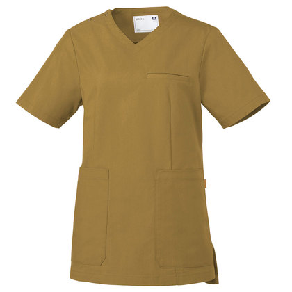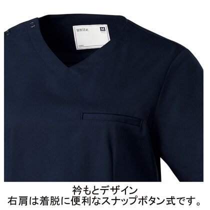高密度でハリのあるストレッチ素材を使用したUNITEブランドのレディススクラブ。シェイプされたウェストまわりもスタイリッシュな印象です。左胸ポケット、両腰ポケット(右:内ポケット)、両脇スリット入り。織物素材の《ストレッチギャバジン》は、高密度に織り上げた丈夫でハリのある素材。上品な光沢と動きやすいストレッチ性があるハイエンドの素材です。ストレッチ素材。