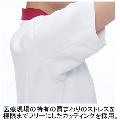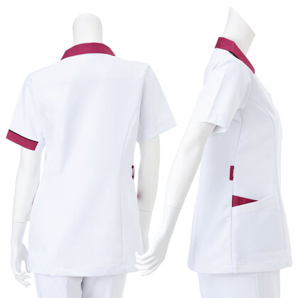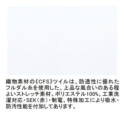 シンプルなデザインと配色で、刺繍やプリントが良く映えるレディスチュニックです。左胸ポケット(PHSポケット付き)、両腰Wポケット、右脇ループ、肩回りにストレスのないエアアームカット仕様。織物素材の《CFS》ツイルは、防透性に優れたフルダル糸を使用した、上品な風合いのある程よいストレッチ素材。工業洗濯対応・SEK(赤)・制電、特殊加工により吸水・防汚性能を付加してあります。