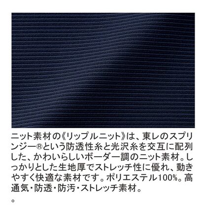 上質なボーダー調のストレッチ素材を使用したスカート。医院の受付けを彩る上質感あふれる商品です。ウェスト後ろ裏にカーブゴムを配置、動きに合わせて伸縮する、窮屈感のないはき心地♪ ニット素材の《リップルニット》は、東レのスプリンジー®という防透性糸と光沢糸を交互に配列した、かわいらしいボーダー調のニット素材。しっかりとした生地厚でストレッチ性に優れ、動きやすく快適な素材です。