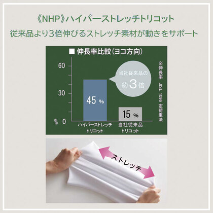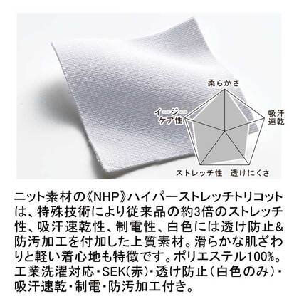 従来品の3倍伸びるニット素材でストレスフリーのレディスパンツです。脇ゴム、ノータック、前後ダーツ、前ファスナー、両脇ポケット、後ろメッシュ付き。ニット素材の《NHP》ハイパーストレッチトリコットは、従来品の約3倍のストレッチ性、吸汗速乾性、制電性、白色には透け防止&防汚加工を付加した上質素材。滑らかな肌ざわりと軽い着心地も特徴です。SEK(赤)・透け防止(白色のみ)・吸汗速乾・制電・防汚加工付き。