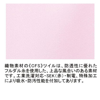 パステルカラーが朗らかな、ケアワークにお勧めの男女兼用スクラブ。腕の稼働を妨げないエアーアーム裁断を採用しています。左胸ポケット(内側PHSポケット)、両腰Wポケット、右脇キーループ付き。織物素材の《CFS》ツイルは、防透性に優れたフルダル糸を使用した、上品な風合いのある素材。工業洗濯対応・SEK(赤)・制電、特殊加工により吸水・防汚性能を付加してあります。
