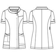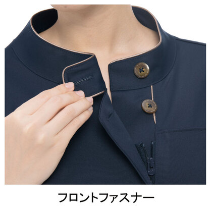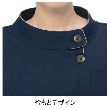 首回りが綺麗に見えるクラシカルな衿もとに、アクセントボタンがお洒落なチュニック。左胸ポケット、両腰Wポケット、右脇キーループ付き。ニット素材の《AY》ワープニットは、冷感性能、通気性、吸汗性を従来素材より大幅に改善した機能性素材。きめ細やかな均一の美しい表面感で、ストレッチ性も優れています。工業洗濯対応・SEK(赤)・制電、特殊加工により吸水・防汚性能を付加してあります。