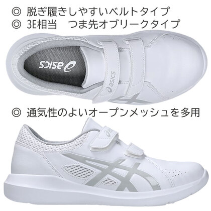 疲れにくいアシックスのナースシューズ。このモデルの特徴は①通気性の良いオープンメッシュの多採用②靴先に消臭効果抜群の消臭繊維MOFFを配置(活性炭対比の消臭即効性10倍、持続性50倍、耐久性にも優れています)③オリジナルソールによる軽量化(175ℊ/23.5㎝)。足幅ワイドの3E、つま先ラウンドタイプ、中敷き取外し式、マジックテープ仕様となります。
