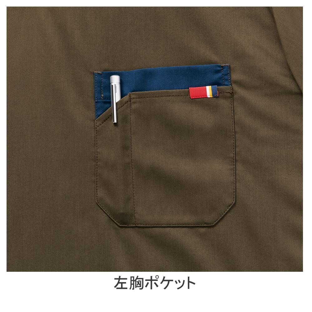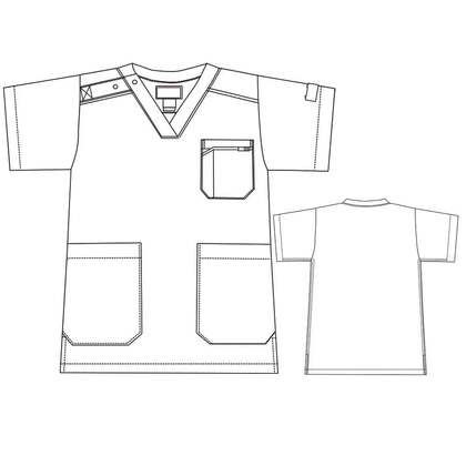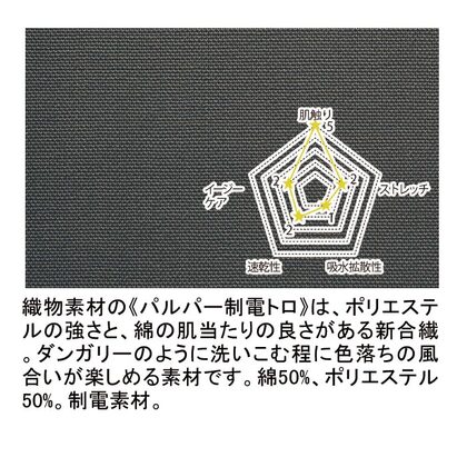 肩まわりと左胸ポケットに意匠を凝らしたUNISEXスクラブです。綿高混率ならではの肌触りも特徴です。右肩ドットボタン、左胸デザインポケット、両腰ポケット付き。織物素材の《パルパー制電トロ》は、ポリエステルの強さと、綿の肌当たりの良さがある新合繊。ダンガリーのように洗いこむ程に色落ちの風合いが楽しめる素材です。綿50%、ポリエステル50%。制電素材。