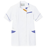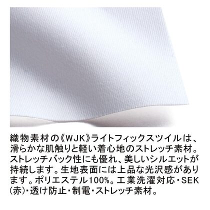 バネのようなストレッチが自慢の女性用衿付きSCRUBです。パステルカラーのアクセントに、曲線を多用した親しみやすさを感じるデザイン、衿もと識別テープ、左胸/両腰ポケット、左肩/両脇ループ、バックプリーツ仕様。織物素材の《WJK》ライトフィックスツイルは、滑らかな肌触りと強力なストレッチ性、上品な光沢感がある素材。ポリエステル100%。工業洗濯対応・SEK(赤)・透け防止・制電・ストレッチ素材。